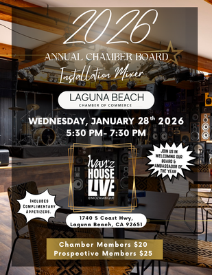 Join the Mayor of Laguna Beach and the Laguna Beach Chamber of Commerce at the Chamber Installation Mixer to instate the 2026 Board of Directors to the Laguna Beach Chamber of Commerce.